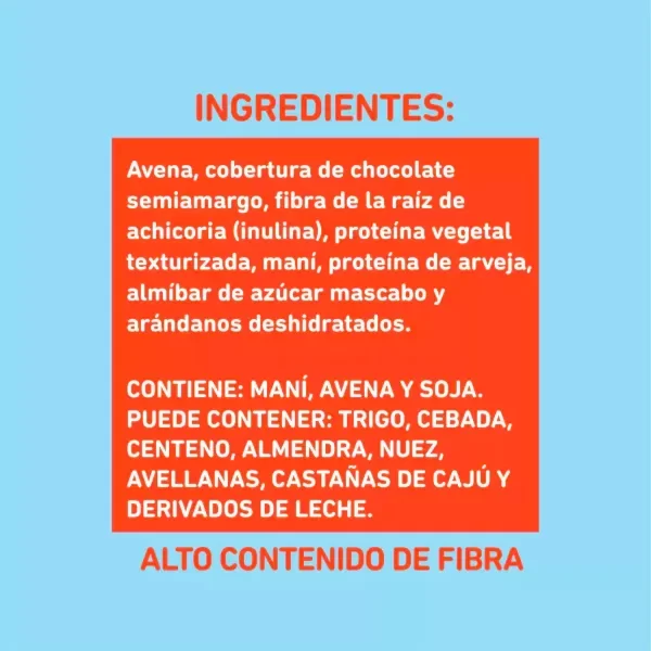 Disfruta un snack delicioso y ligero que combina sabor y nutrición en cada bocado. Con 5 g de proteína vegetal, 5 g de fibra y solo 90 calorías, es la opción perfecta para mantenerte saciado y con energía entre comidas. Elaborado sin conservantes, su mezcla de avena, maní, arándanos y una cobertura de chocolate semiamargo ofrece un equilibrio ideal entre crujiente, dulzor natural y un toque de indulgencia saludable.