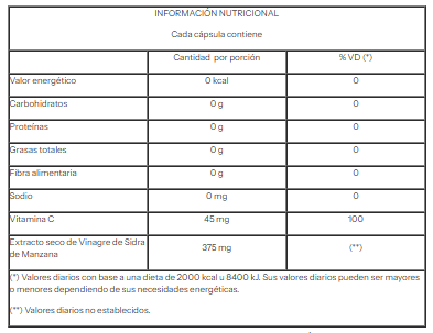 Ingredientes: Extracto seco de Vinagre de Sidra de Manzana y Vitamina C
