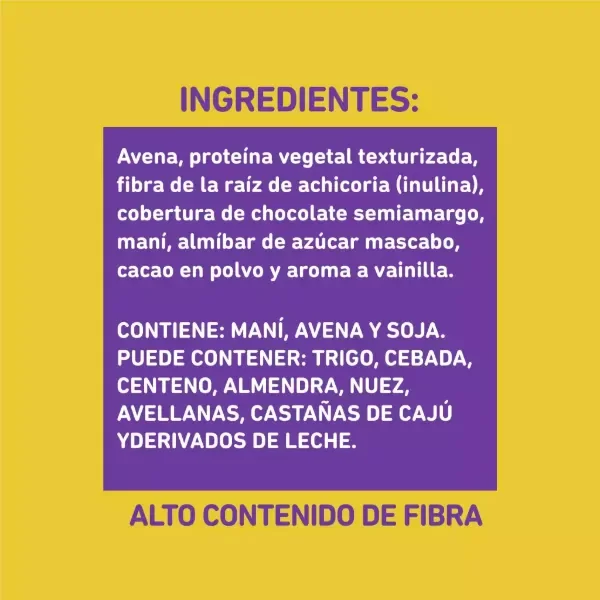 Energía real y sabor intenso se unen en esta barra elaborada con ingredientes auténticos y nutritivos. Con 8 g de proteína vegetal y 8 g de fibra, es una opción ideal para mantenerte saciado, activo y equilibrado durante el día. Su fórmula sin conservantes combina cacao, avena, maní y una irresistible cobertura de chocolate semiamargo, logrando una textura suave y crujiente con un perfil de sabor profundo y natural.