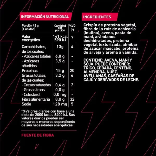 Disfruta de una barra pensada para darte energía limpia y sostenida. Con 15 g de proteína vegetal y 8 g de fibra, es el snack ideal para mantenerte activo y satisfecho durante más tiempo. Su combinación de arándanos y pasta de maní crea un equilibrio perfecto entre dulzor natural, suavidad y un toque frutal vibrante.