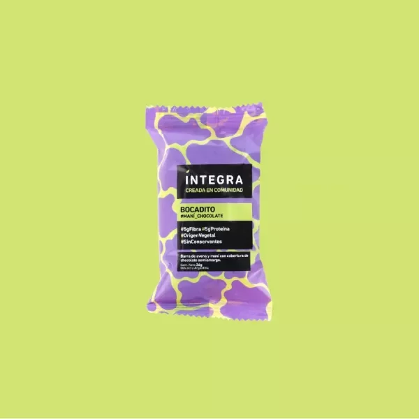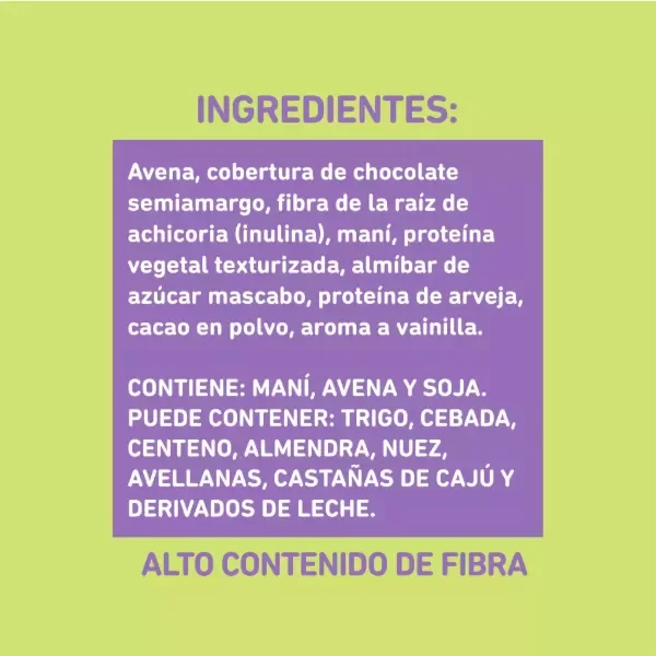 Un snack ligero y nutritivo pensado para acompañarte en cualquier momento del día. Con 5 g de proteína vegetal, 5 g de fibra y solo 90 calorías, brinda energía sostenida y saciedad sin comprometer tu alimentación. Elaborado sin conservantes, combina avena, maní y una delicada cobertura de chocolate semiamargo, ofreciendo una textura crujiente y un sabor intenso y natural.