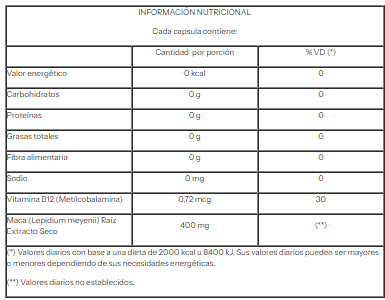 Ingredientes: Maca (Lepidium Peruviarum) y Vitamina B12 (Metilcobalamina).