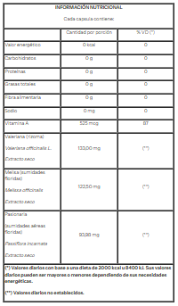 Relax Blend es una combinación de extractos vegetales tradicionalmente utilizados para disminuir la ansiedad de manera paulatina, que puede contribuir y potenciar el tratamiento empleado para estos trastornos. Relax Blend combina Pasionaria, Valeriana y Melisa. Pasionaria, que actúa como un sedante suave que ayuda a promover la calma y bajar la tensión, los alcaloides en su composición poseen cualidades anti-depresivas. Valeriana, que aumenta la disponibilidad del ácido gamma-aminobutírico (GABA), segundo neurotransmisor químico más común en el cerebro humano que, calma la actividad neuronal, reduce la irritabilidad y la ansiedad, estimula la relajación y brinda sensación de tranquilidad. Por último Melisa, una de las mejores alternativas vegetales contra los problemas nerviosos dado su alto contenido en ácidos caféico y oleanólico.